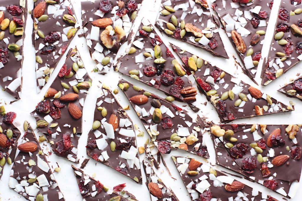 - Sprinkle melted chocolate with trail mix, coconut, and salt. Refrigerate bark for about 10 mins until completely set.