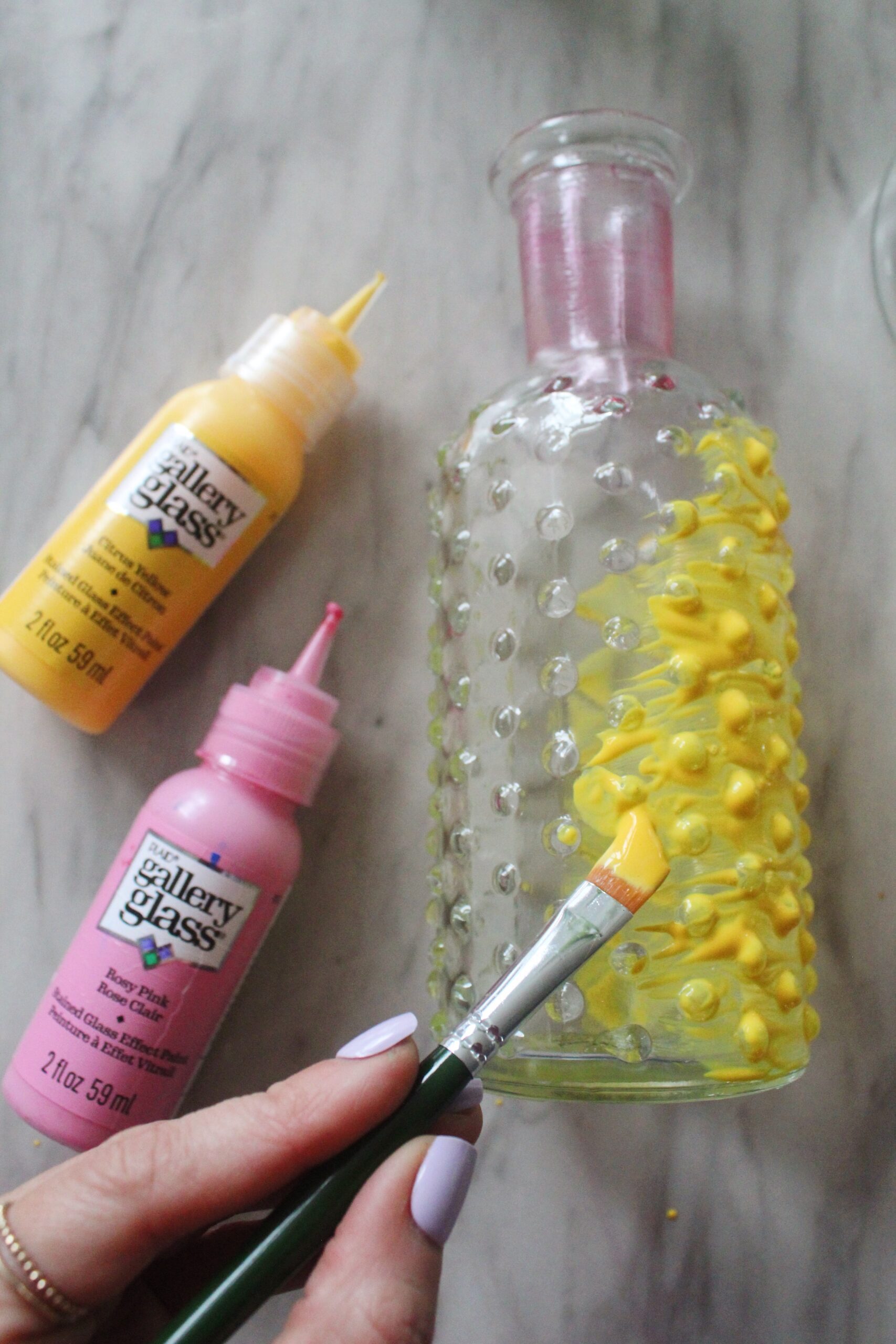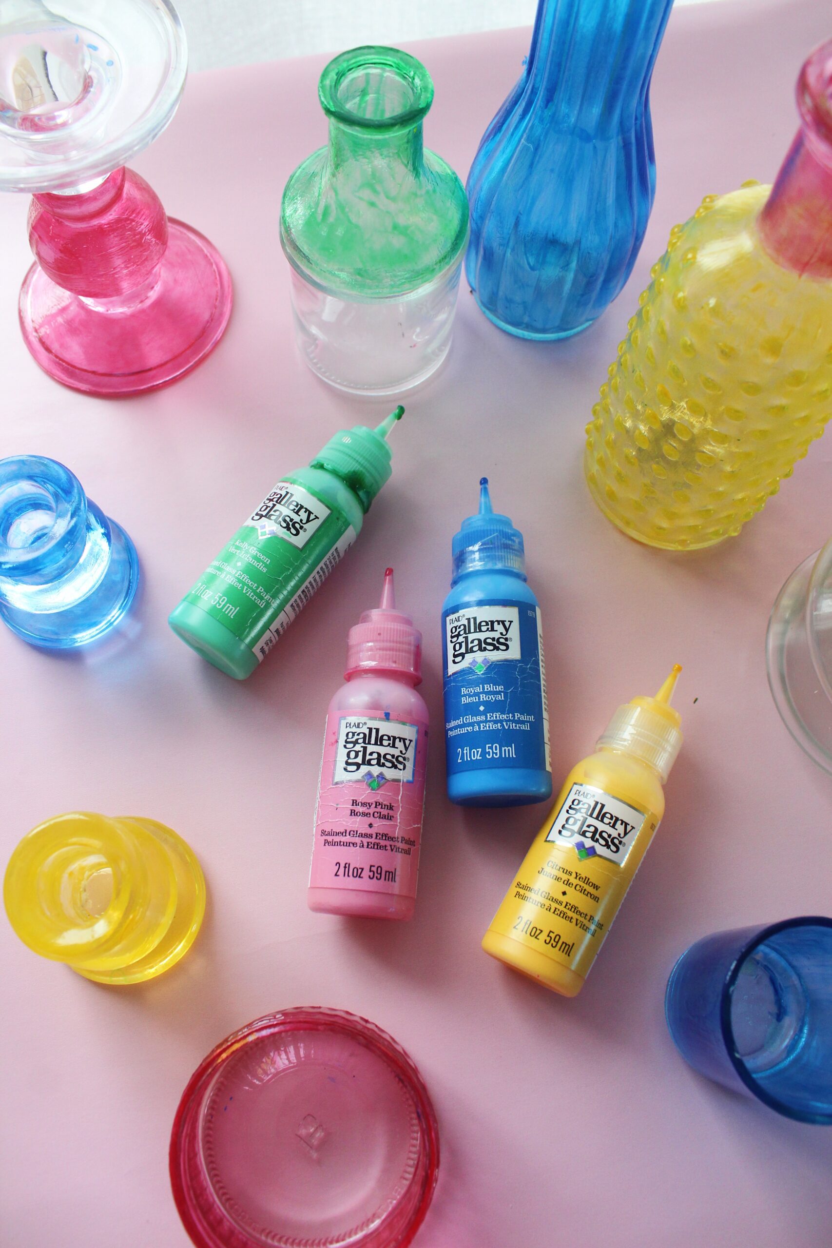 The possibilities for creating with this classic home decor item are endless, affordable, and so much fun. That’s why, when we started noticing tinted glass candlesticks in our favorite home decor boutiques, we had to figure out a way to make create some for ourselves. Enter–Gallery Glass paint!