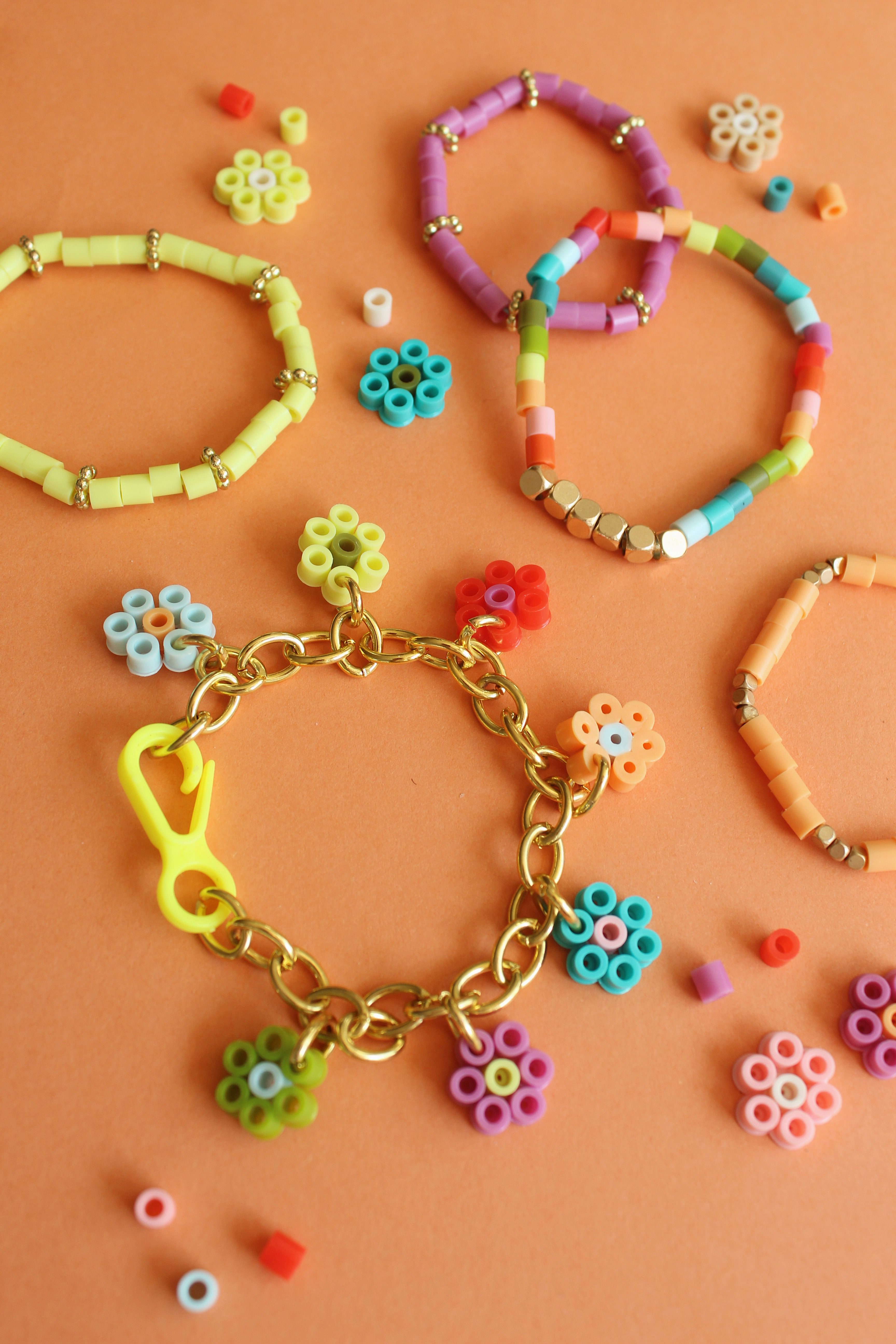 We’ve noticed a 90’s inspired TikTok trend as of late where makers are creating daisy chain belts using Perler beads (those beads you put on a mini peg board and then melt together with an iron). The results are super cute and if you are an adorable gen-z-er this trend is definitely for you. However, if you are a 30-something mother of two who thinks this project is cute, but at the moment you’re not too interested in putting what is essentially a necklace around your hips, we get it. So, we decided to make this trend our own, scale it down, and make the daisy chain belts into charm bracelets!